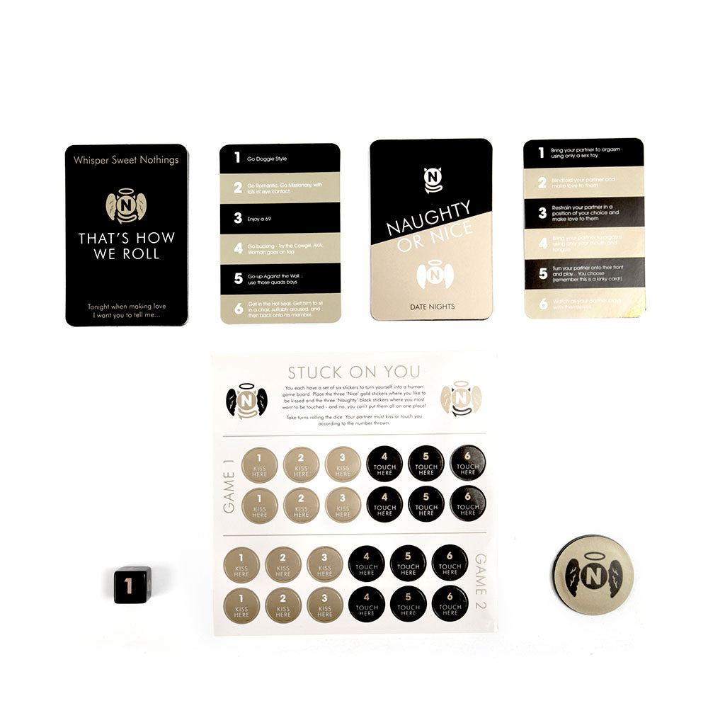 Three unique games packed with Naughty and Nice ideas to make any relationship more spontaneous! The “Nice” suggestions will help you to create romantic date ideas and tender moments for you both to share, bringing you even closer as a couple. Whilst the “Naughty” suggestions will add sizzle and spice to your love life, with kinky ideas and erotic surprises. A flip of the poker chip and a roll of the dice will decide when you are Naughty and when you are Nice.